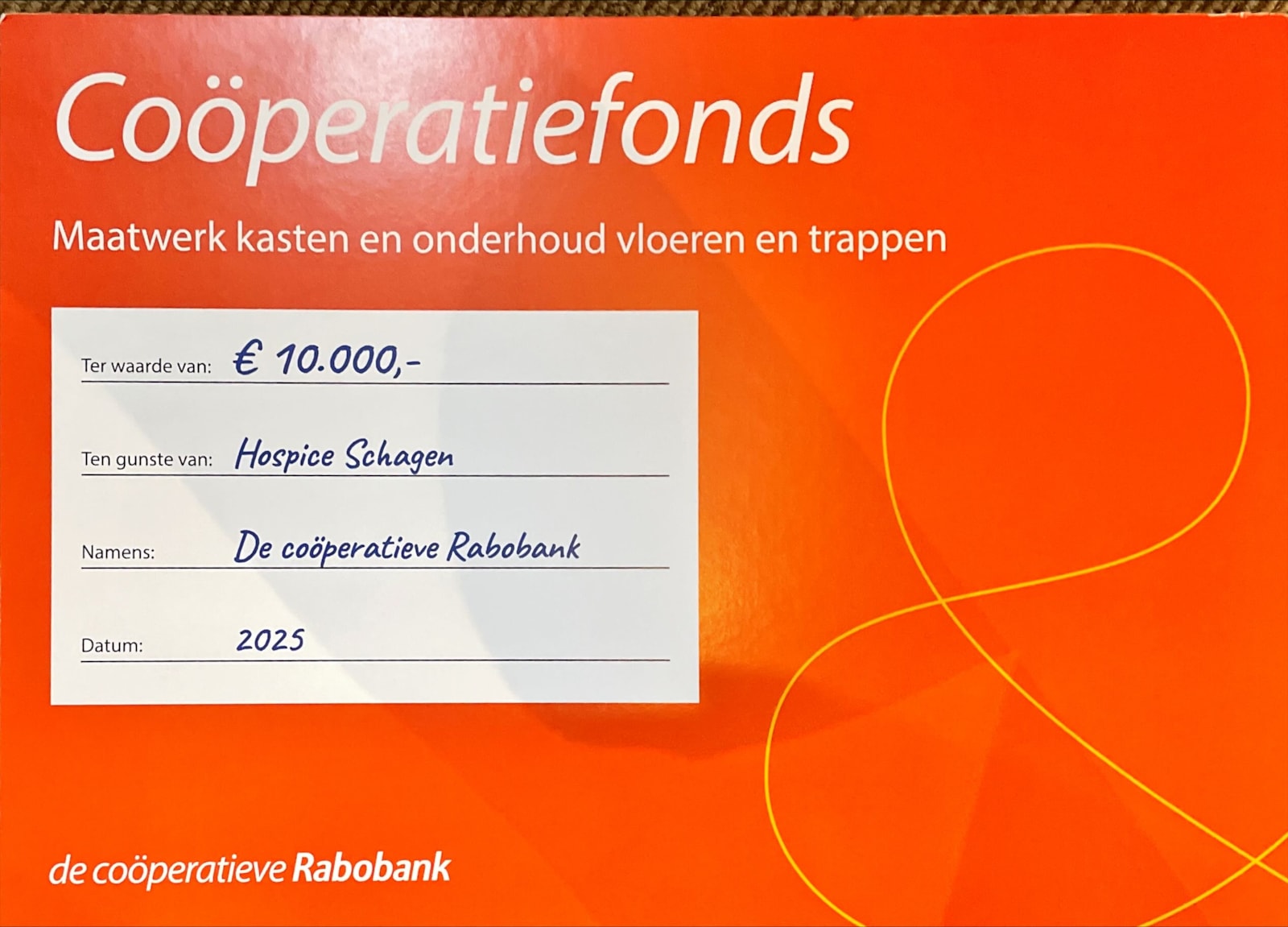 Zojuist mochten wij een prachtige cheque in ontvangst nemen. Dit is mogelijk gemaakt door het coöperatiefonds van de Rabobank